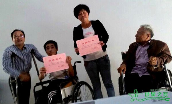 绿星之家理事长阎铁鲁(右一),执行理事齐乾坤(右四)分别为王磊、刘慧慧颁发结业证书
