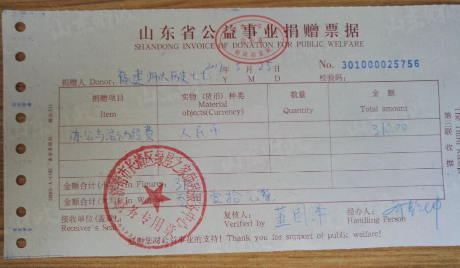 福建师大历史系七七届毕业生为济南市长清区绿星之家助残服务中心捐赠310元办公经费。