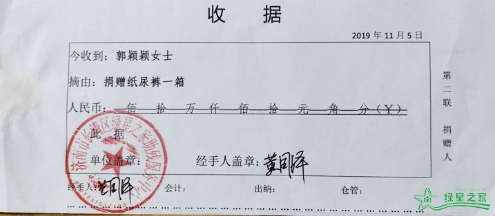 2019年11月5日绿星之家助残服务中心接收济南爱心残友郭颖颖女士捐赠的纸尿裤1箱。