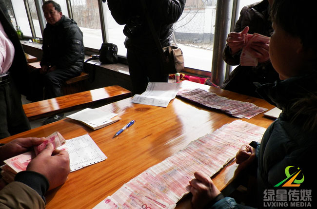 年会上,机构相关负责人为到场的股东们发放年终红利。