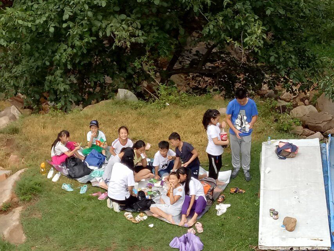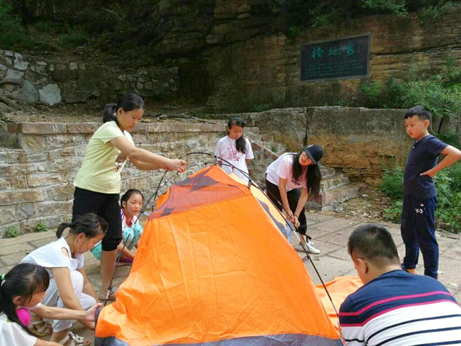随后,孩子们急行军3公里,来到济南七十二名泉之一的千年古泉——檀抱泉。老师指导孩子们搭建起帐篷和使用登山杖,希望通过练习至少可以使孩子们学会一点野外生存的本领,古檀青葱,山风青凉,孩子们的笑声洒落泉畔,席地而坐的野餐定格成美好的回忆。