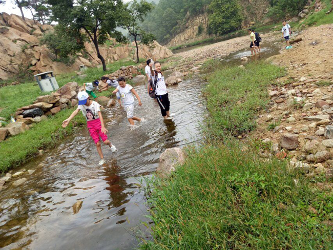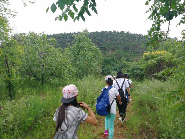 午餐后稍事休整,老师们带着孩子们在青山绿水间穿行,向向凤凰岭进发。进大门前,刘杨老师特地捡了一根枯树枝,一头削尖,用来保护孩子们钟爱小动物与蛇类的侵扰,紧跟在老师身后的孩子们歌唱着,蹦跳着,兴奋着,他们爬山,追蝴蝶,涉水,逮小鱼,甚至想象着如果突然出现了土狼他们该怎么办?是逃跑,还是团结一心治服它。此刻,他们的课本在遥远的地方睡眠,他们的梦想和快乐在山岭上起舞飞扬……