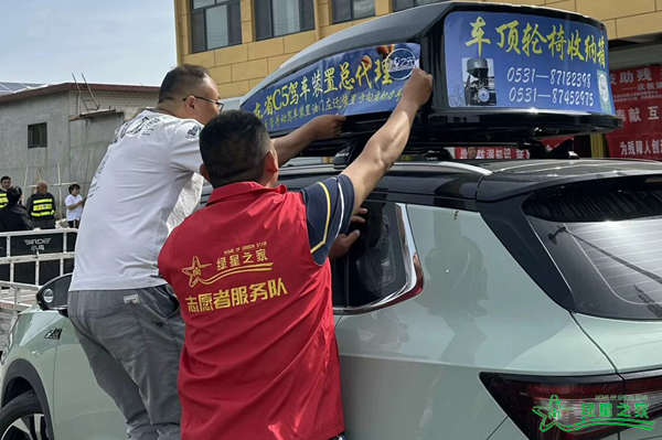 两们志愿者正在为残友装扮C5残疾人专用车。