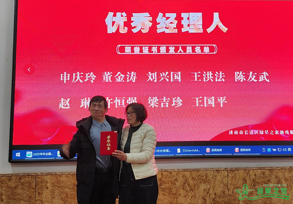 绿星之家副理事长侯洁(左二) 为优秀经理董金涛颁发荣誉证书。