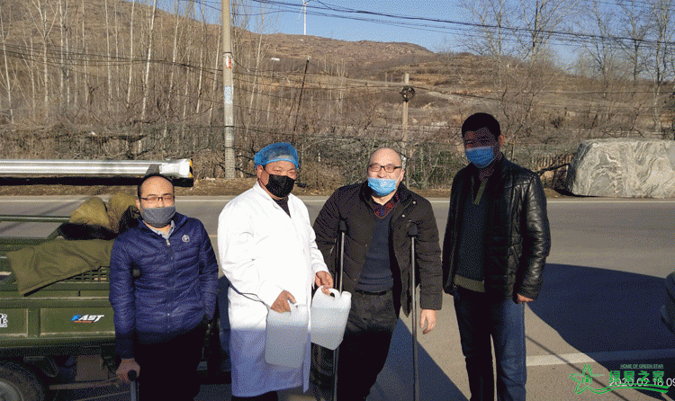 济南市长清区万德街道六律村卫生室梅廷忠大夫(左二)接受酒精捐赠