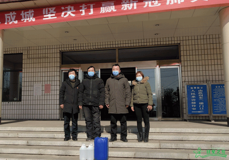 万德街道卫生院副院长张庆亭(左一)、防保科科长刘延伟(左二)接受酒精捐赠