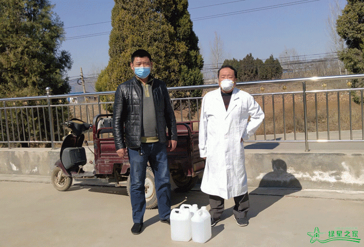 济南市长清区万德街道西房村卫生室房玉兴大夫(左二)接受酒精捐赠