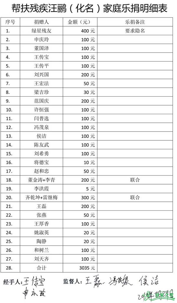 当汪鹂身陷困境之时,绿星之家的齐乾坤、冯茂泉、雷继梅、王传宝、王磊、侯洁、董国泽、申庆玲等也在为她家紧锣密鼓地发起捐款活动,活动得到了残友、志愿者与爱心友人的支持,仅二天就完成了3000元预期目标。