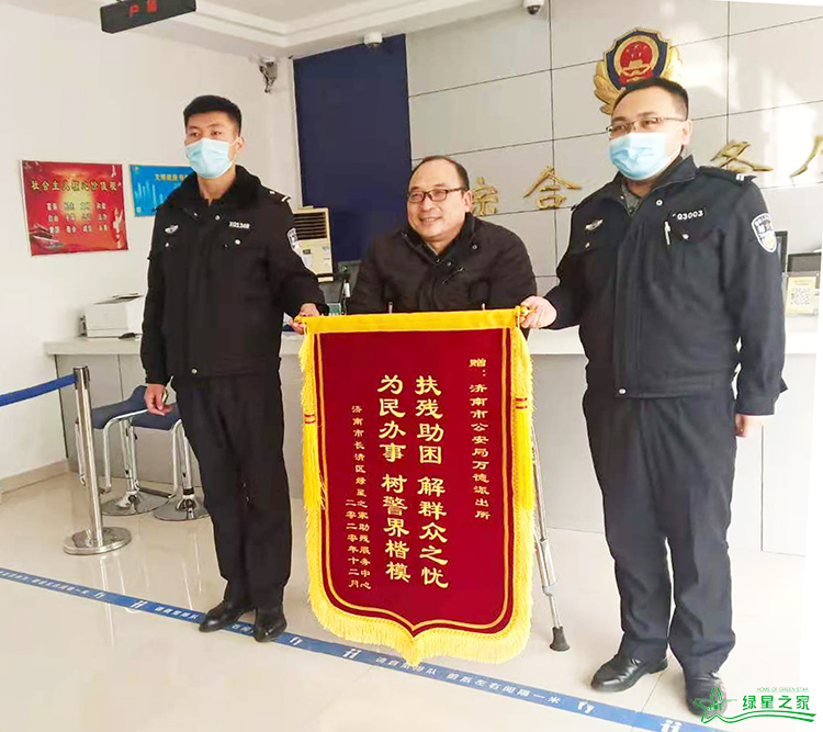12月22日,为感谢济南市公安局万德街道派出所民警,多年来为绿星之家残友提供的帮扶行动,执行理事齐乾坤代表绿星之家助残服务中心特向万德街道派出所赠送“扶残助困 解群众之忧;为民办事,树警界楷模”锦旗一面