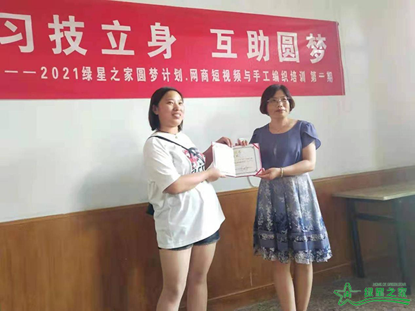 绿星人事干事侯洁(右)向学员阿兰(左)颁发结业证书