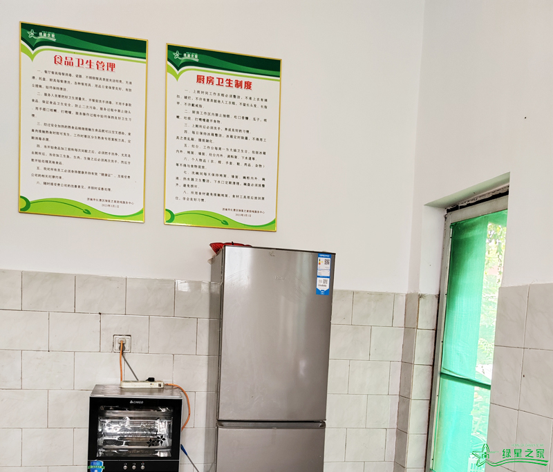 厨房设备不仅有菜也,还有冰箱与消毒柜,管理制度也都配齐