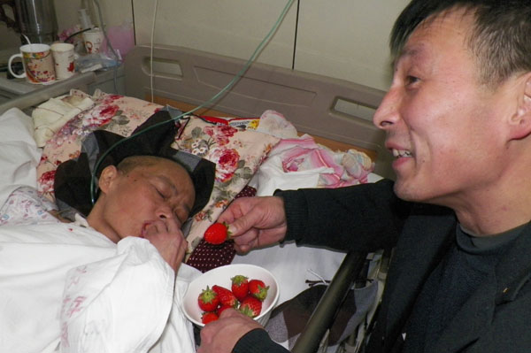 2014年1月31日春节,经过一个多月的沉睡,凤姐醒了,丈夫王先生充满喜悦地给她喂草莓