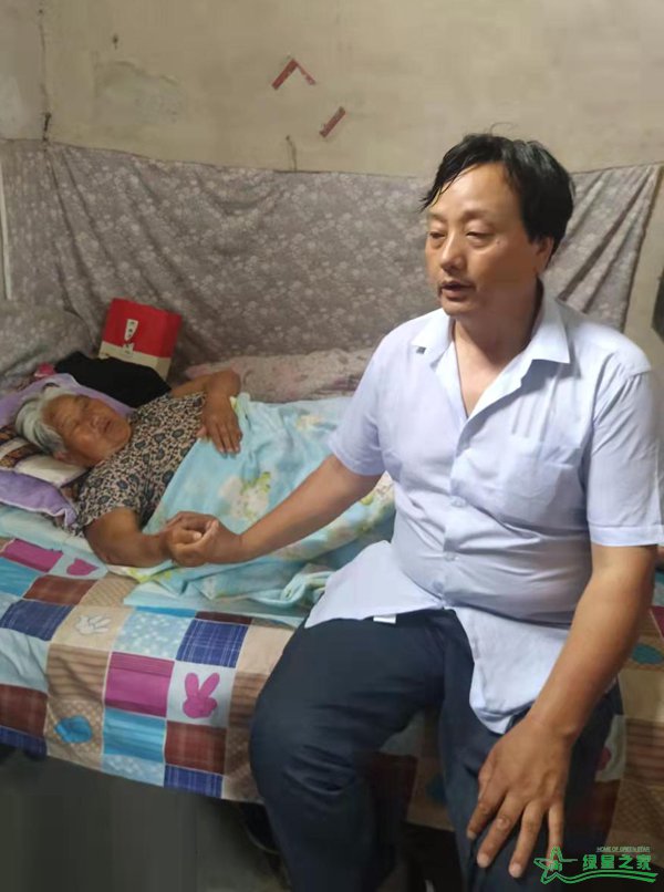 行走不便的冯茂泉大夫冒着酷暑天气,来不及擦汗,赶紧为大娘号脉